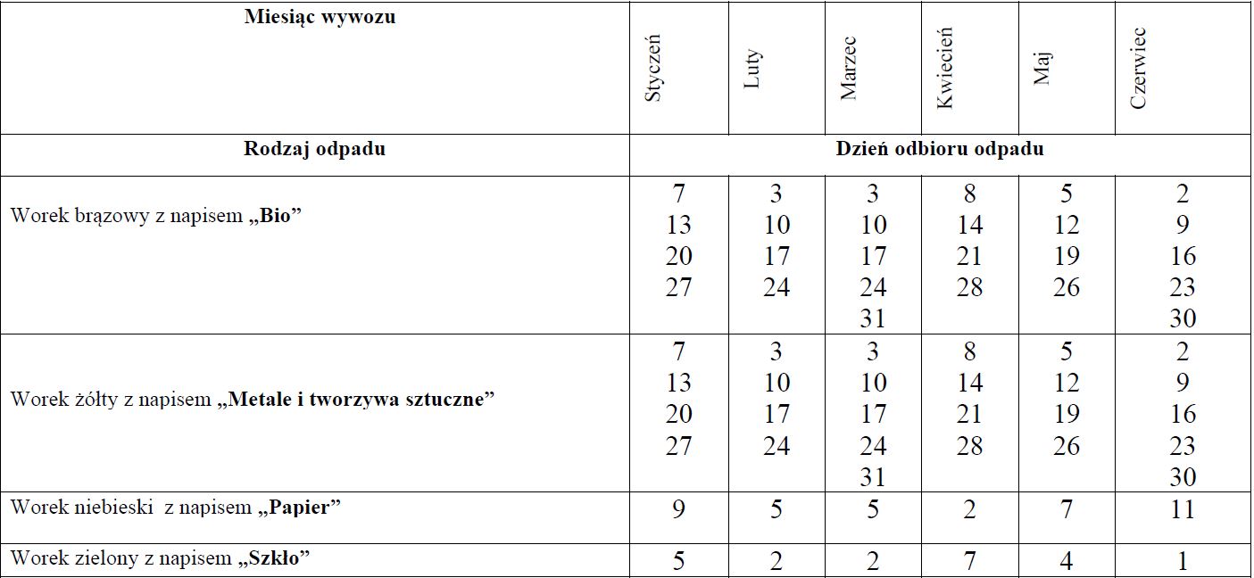 Worki należy w dniu wywozu wystawiać związane, w widocznym, dostępnym dla samochodu ciężarowego miejscu przy drodze publicznej, przed ogrodzeniem posesji do godziny 7:00 rano.
